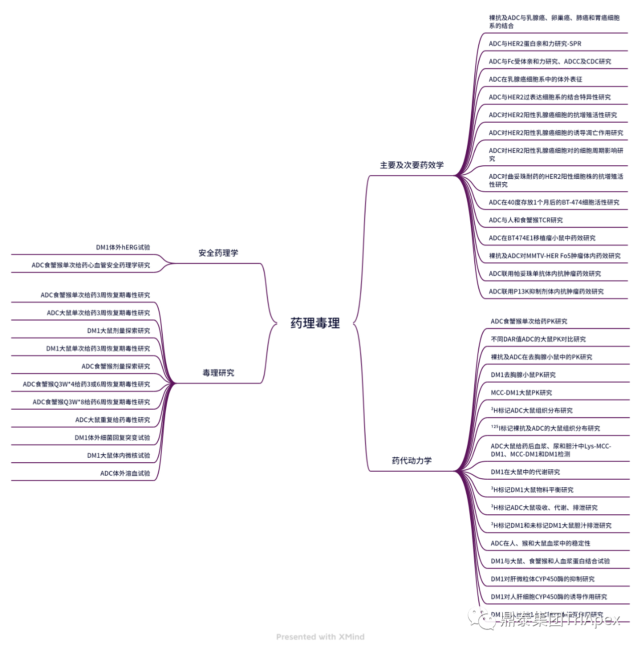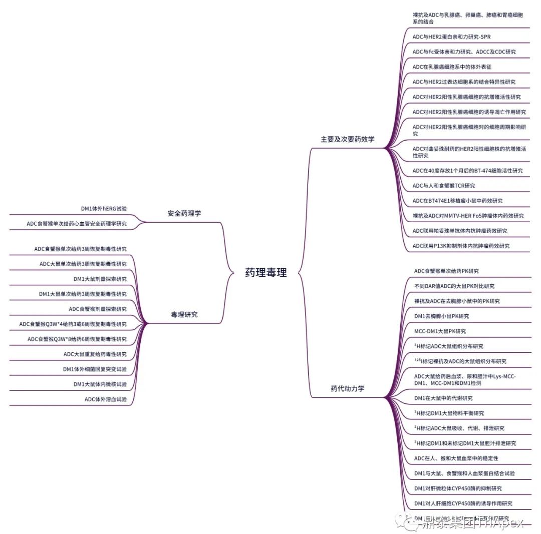Kadcyla是由ImmunoGen/Roche公司开发的靶向HER2的ADC产品,通用名Trastuzumab emtansine,叫的比较多的名字是T-DM1。2013年2月22日获批上市,用于HER2阳性乳腺癌的治疗。是第一款毒素为DM1的ADC产品,也是首个作用于实体瘤的ADC产品。考虑到DM1是全新毒素,非临床部分研究如下图所示,非常系统。
