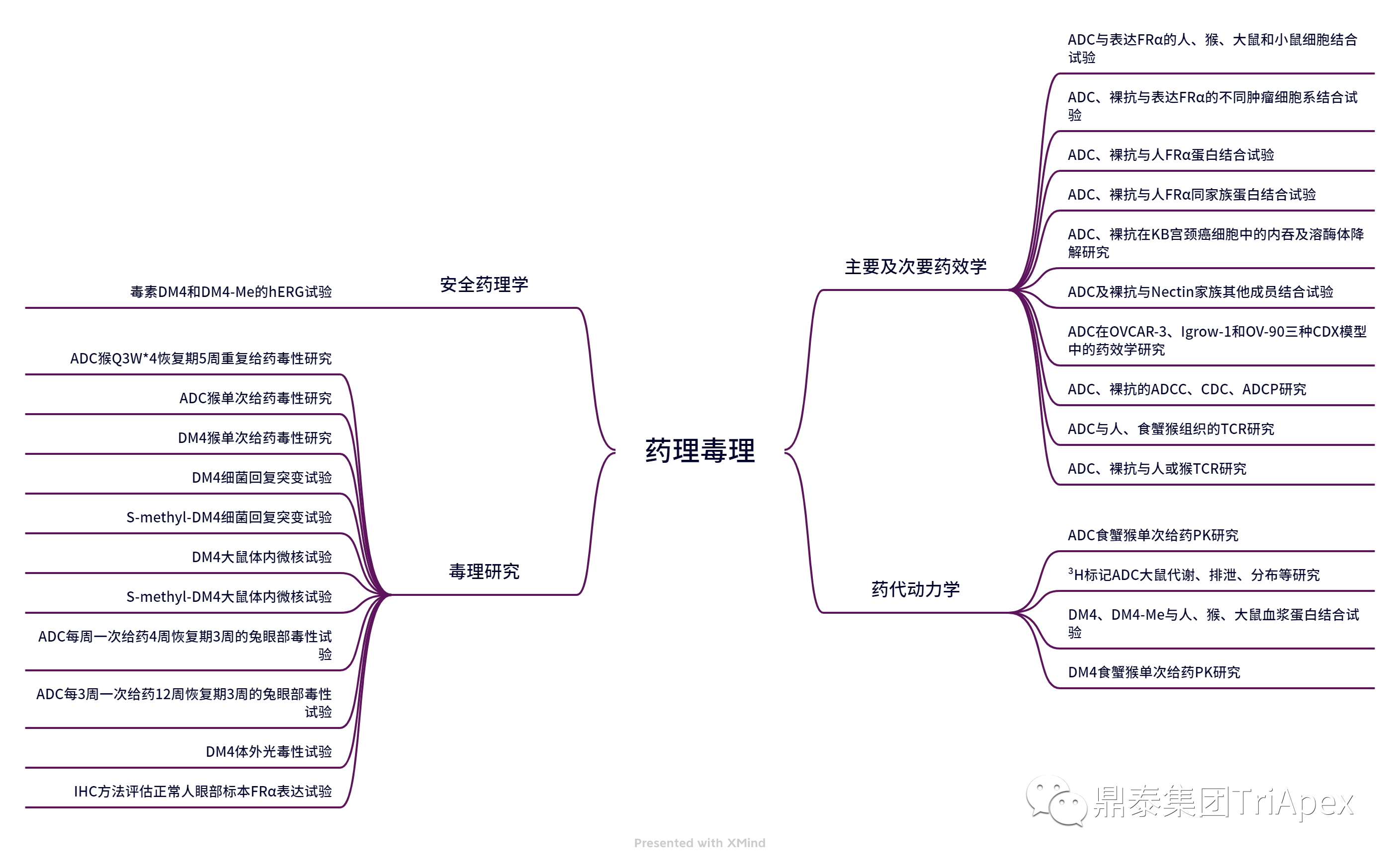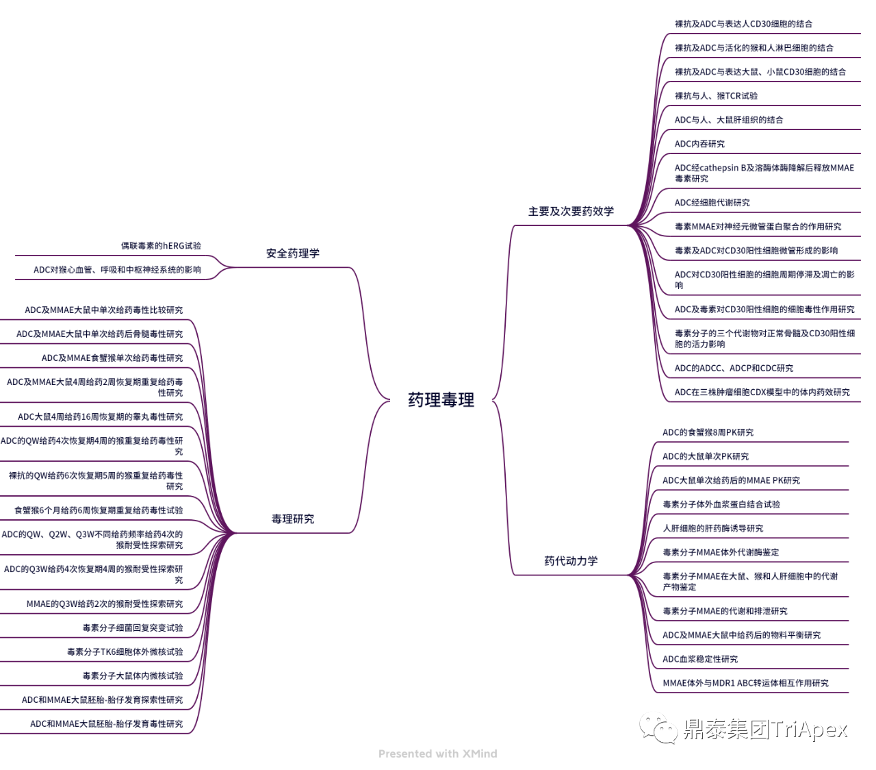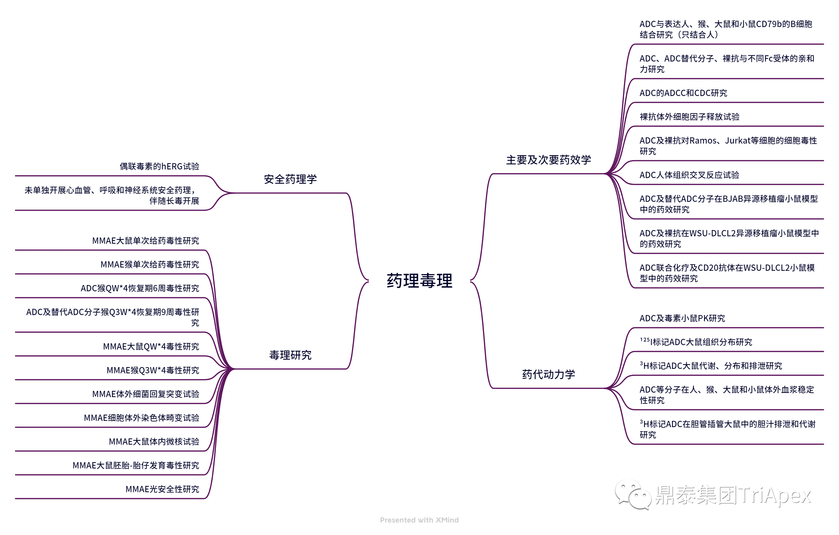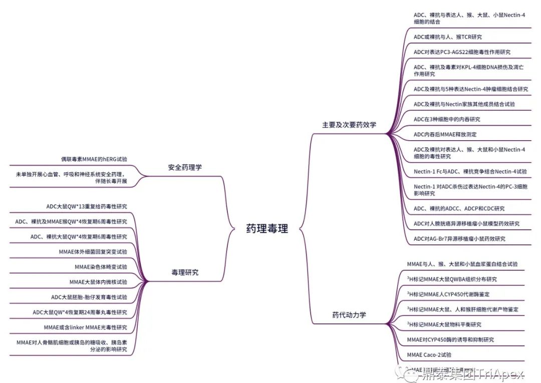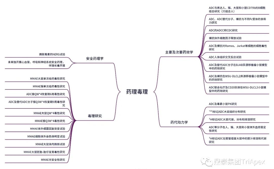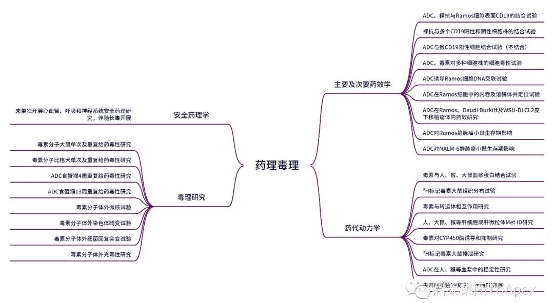 目前全球已上市ADC产品共15款,其中GSK/Seattle Genetics靶向BCMA的Belantamab Mafodotin因验证性Ⅲ期临床失败,已经退市。荣昌生物的RC-48仅在国内上市,公开资料有限。除去这两款产品,对剩余13款ADC产品的非临床研究package进行了大致梳理。ADC产品是抗体偶联了毒素,本质上既有生物药的特点,同时又要考虑化药的评价策略。毒素分子的创新程度和历史研究数据对体内外药代动力学、安全药理学、遗传毒性、生殖毒性以及一般毒的设计有很大影响。全新或毒性特征不明确的毒素分子需要开展更加全面和系统的表征。当然,所有试验并不是要求在IND之前全部完成,可以结合化药、生物药研究特点,以及《抗体偶联药物非临床研究技术指导原则》等要求,分阶段开展,支持不同阶段的临床或上市研究。