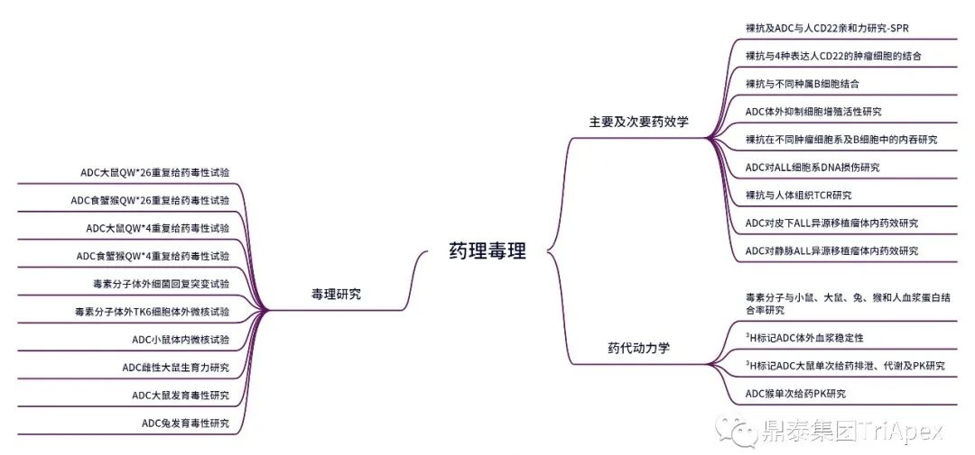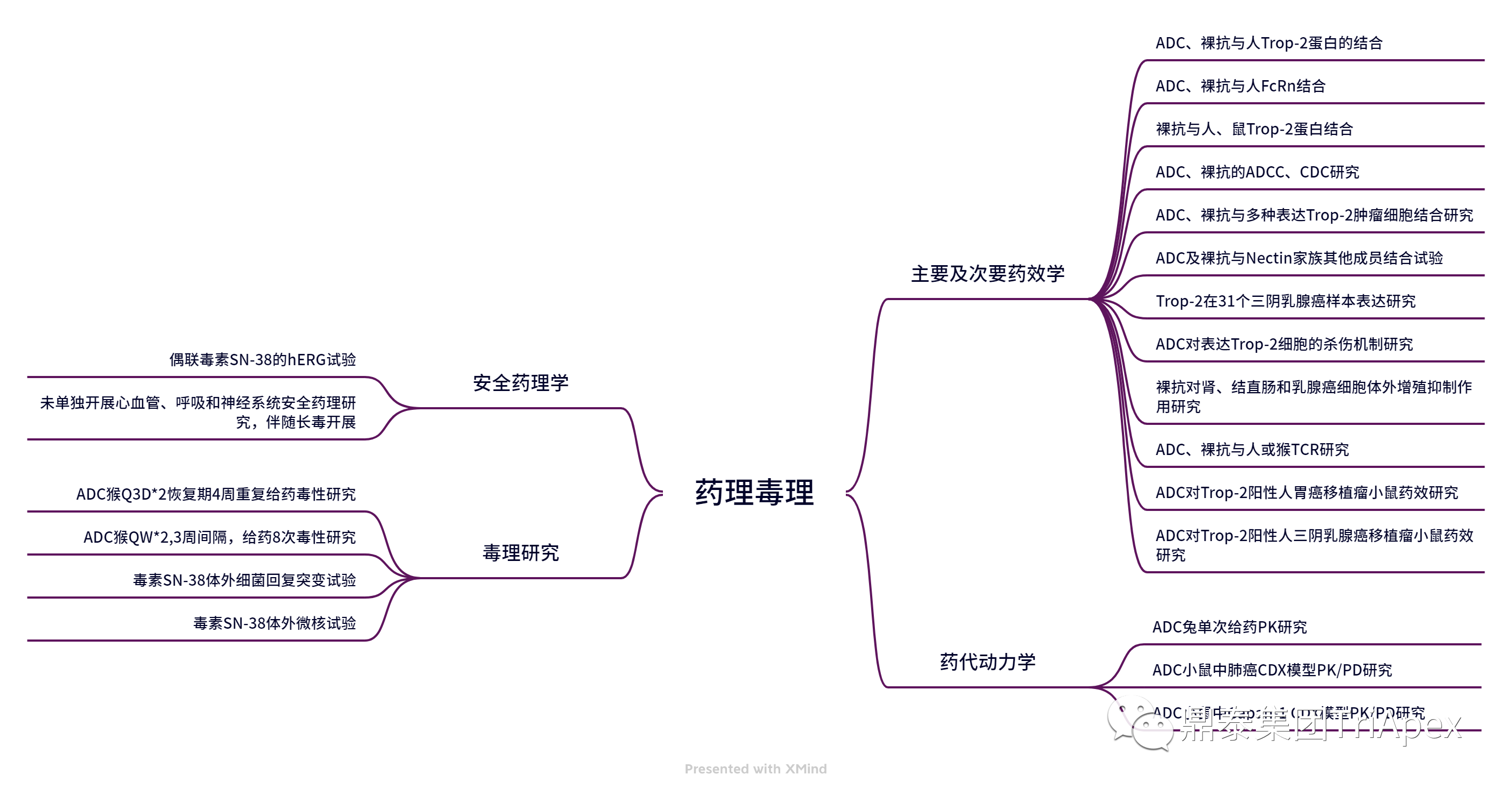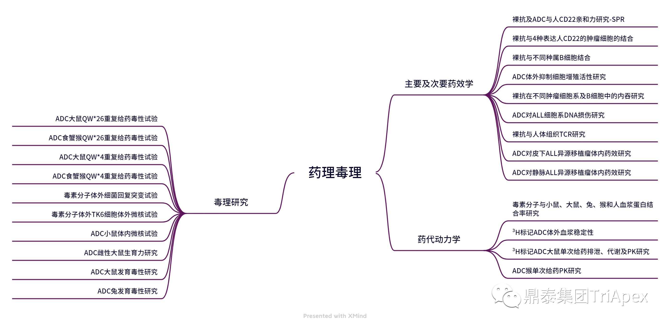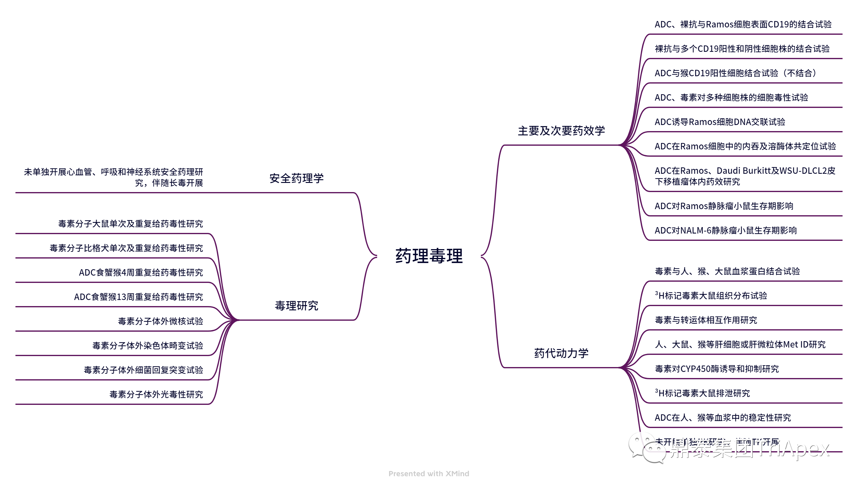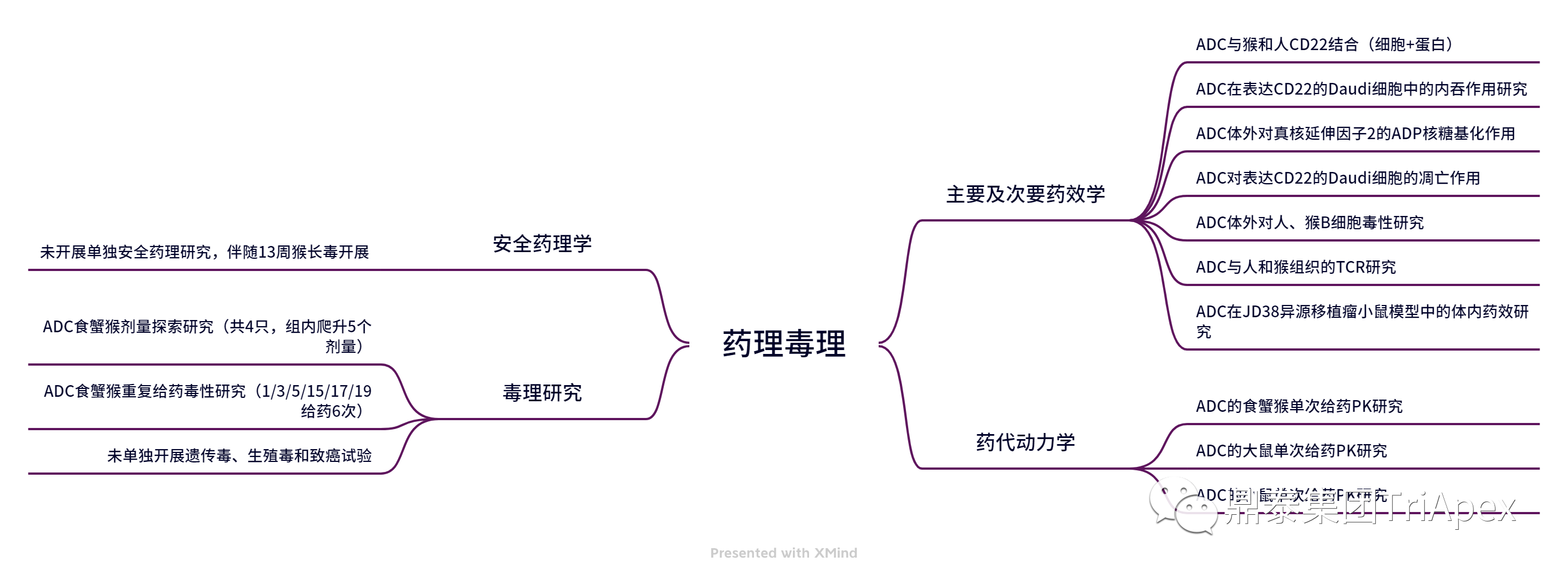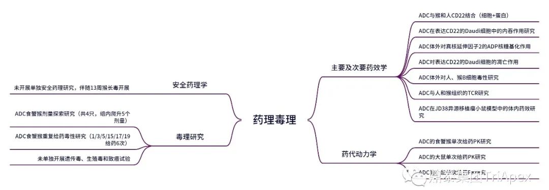 Besponsa是由Pfizer/Celltech公司开发的靶向CD22的ADC产品,通用名Inotuzumab ozogamicin。2017年8月17日获批上市,用于急性淋巴细胞白血病的治疗。毒素与首款上市的ADC产品Gemtuzumab ozogamicin类似,都是采用的Calicheamicin,即可使DNA双链断裂的卡奇霉素。考虑到Calicheamicin药理作用、毒性特征和代谢特征已开展过详细研究,特点已经比较明确,非临床研究未再对毒素部分进行详细表征。整体非临床研究内容也精炼了很多。